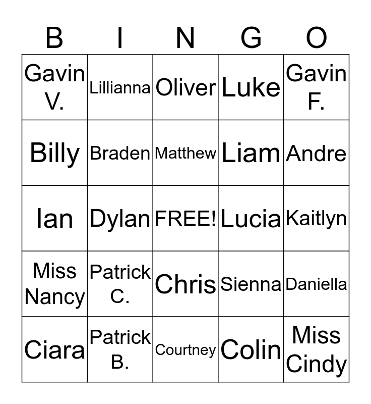 This bingo card has a free space and 24 words: Patrick C., Patrick B., Matthew, Ciara, Gavin F., Gavin V., Billy, Lillianna, Lucia, Chris, Liam, Ian, Sienna, Daniella, Braden, Colin, Kaitlyn, Oliver, Andre, Dylan, Miss Cindy, Miss Nancy, Luke and Courtney.