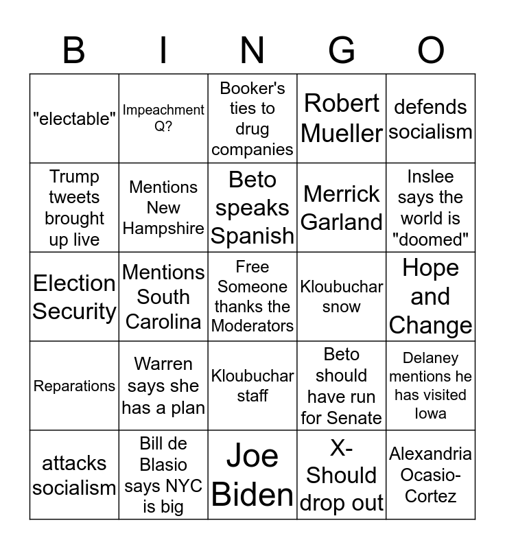 This bingo card has a free space and 24 words: Warren says she has a plan, Bill de Blasio says NYC is big, Beto speaks Spanish, attacks socialism, defends socialism, "electable", Trump tweets brought up live, Impeachment Q?, Kloubuchar snow, Kloubuchar staff, Merrick Garland, Election Security, Beto should have run for Senate, Delaney mentions he has visited Iowa, Mentions New Hampshire, X- Should drop out, Hope and Change, Booker's ties to drug companies, Inslee says the world is "doomed", Mentions South Carolina, Alexandria Ocasio- Cortez, Reparations, Robert Mueller and Joe Biden.