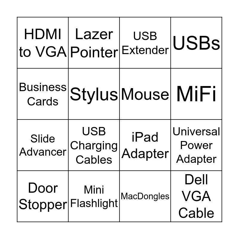 This bingo card has 16 words: Mini Flashlight, Universal Power Adapter, USB Extender, HDMI to VGA, Slide Advancer, Lazer Pointer, iPad Adapter, MacDongles, Business Cards, Stylus, Door Stopper, USBs, USB Charging Cables, MiFi, Mouse and Dell VGA Cable.