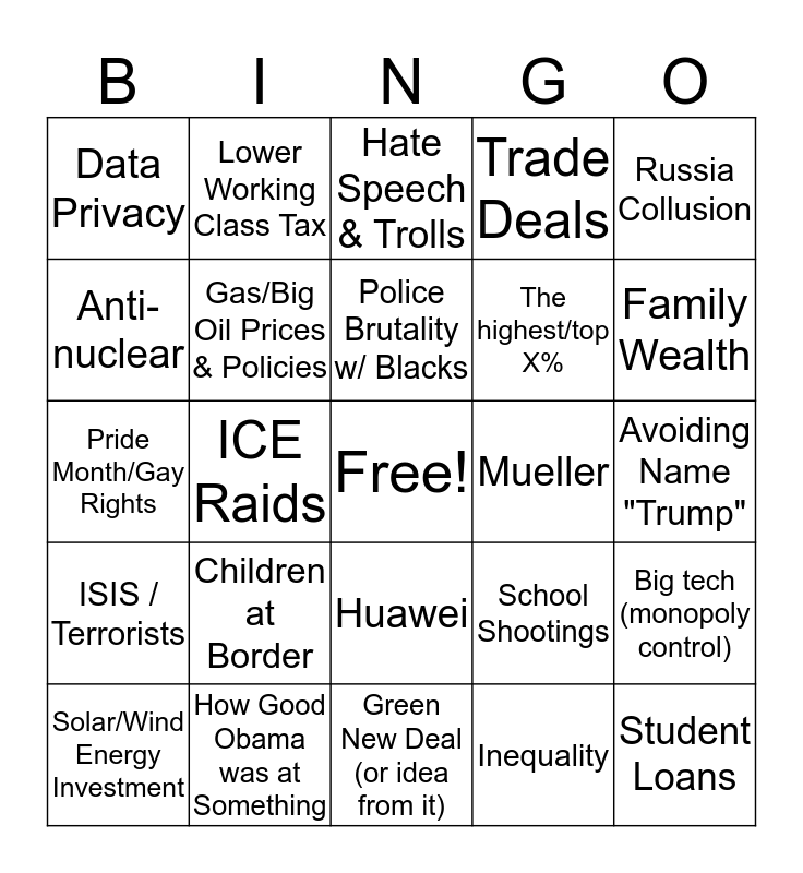 This bingo card has a free space and 24 words: Children at Border, How Good Obama was at Something, Police Brutality w/ Blacks, Solar/Wind Energy Investment, Russia Collusion, Data Privacy, Anti-nuclear, Lower Working Class Tax, Mueller, Huawei, The highest/top X%, Pride Month/Gay Rights, School Shootings, Big tech (monopoly control), Gas/Big Oil Prices & Policies, Inequality, Avoiding Name "Trump", Hate Speech & Trolls, Family Wealth, ICE Raids, Student Loans, ISIS / Terrorists, Trade Deals and Green New Deal (or idea from it).