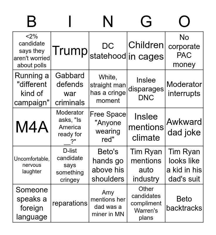 This bingo card has a free space and 39 words: A straight mentions their wife, Beto gives a non-answer, Big, structural change, Gabbard defends war criminals, Someone speaks a foreign language, Beto's hands go above his shoulders, White, straight man has a cringe moment, Amy says, "Back in Minnesota", No corporate PAC money, Uncomfortable, nervous laughter, Moderator asks, "Is America ready for __?", Children in cages, Beto backtracks, Awkward dad joke, Inslee mentions climate, D-list candidate says something cringey, Warren puts someone in their place, <2% candidate says they aren't worried about polls, DeBlasio: "I represent 8 million people", Tim Ryan mentions auto industry, Running a "different kind of campaign", Amy mentions her dad was a miner in MN, Inslee disparages DNC, Moderator interrupts, Candidate mentions their website/social, "People-powered campaign", Gabbard mentions "endless wars", Warren begins with, "Look,", Someone says something sexist, Trump, Some version of "Stronger Together", Iran, DC statehood, reparations, Other candidates compliment Warren's plans, Grassroots donors, Tim Ryan looks like a kid in his dad's suit, M4A and Student debt.