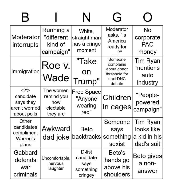 This bingo card has a free space and 44 words: A straight mentions their wife, Beto gives a non-answer, Big, structural change, Gabbard defends war criminals, Someone speaks a foreign language, Beto's hands go above his shoulders, White, straight man has a cringe moment, Amy says, "Back in Minnesota", No corporate PAC money, Uncomfortable, nervous laughter, Moderator asks, "Is America ready for __?", Children in cages, Beto backtracks, Awkward dad joke, Inslee mentions climate, D-list candidate says something cringey, Warren puts someone in their place, <2% candidate says they aren't worried about polls, DeBlasio: "I represent 8 million people", Tim Ryan mentions auto industry, Running a "different kind of campaign", Amy mentions her dad was a miner in MN, Inslee disparages DNC, Moderator interrupts, Candidate mentions their website/social, "People-powered campaign", Gabbard mentions "endless wars", Warren begins with, "Look,", Someone says something sexist, Other candidates compliment Warren's plans, Grassroots donors, Tim Ryan looks like a kid in his dad's suit, M4A, Student debt, The women remind you how electable they are, Amy plays up Midwest nice, Warren calls to break up big tech, Mental health, "Take on Trump", Immigration, Someone complains about donor threshold for next DNC debate, Tax returns, Roe v. Wade and Gun violence prevention.