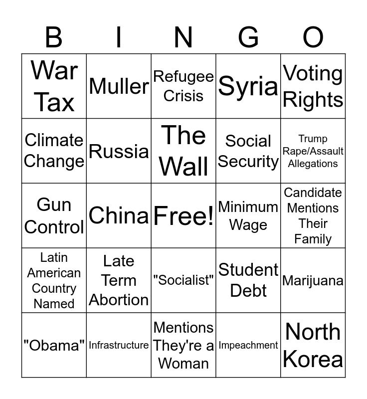 This bingo card has a free space and 24 words: Late Term Abortion, Infrastructure, The Wall, "Obama", Voting Rights, War Tax, Climate Change, Muller, Minimum Wage, "Socialist", Social Security, Gun Control, Student Debt, Marijuana, Russia, Impeachment, Candidate Mentions Their Family, Refugee Crisis, Trump Rape/Assault Allegations, China, North Korea, Latin American Country Named, Syria and Mentions They're a Woman.