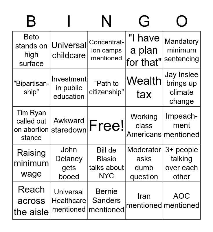 This bingo card has a free space and 24 words: John Delaney gets booed, Universal Healthcare mentioned, "Path to citizenship", Reach across the aisle, Mandatory minimum sentencing, Beto stands on high surface, "Bipartisan-ship", Universal childcare, Working class Americans, Bill de Blasio talks about NYC, Wealth tax, Tim Ryan called out on abortion stance, Moderator asks dumb question, 3+ people talking over each other, Investment in public education, Iran mentioned, Impeach-ment mentioned, Concentrat-ion camps mentioned, Jay Inslee brings up climate change, Awkward staredown, AOC mentioned, Raising minimum wage, "I have a plan for that" and Bernie Sanders mentioned.