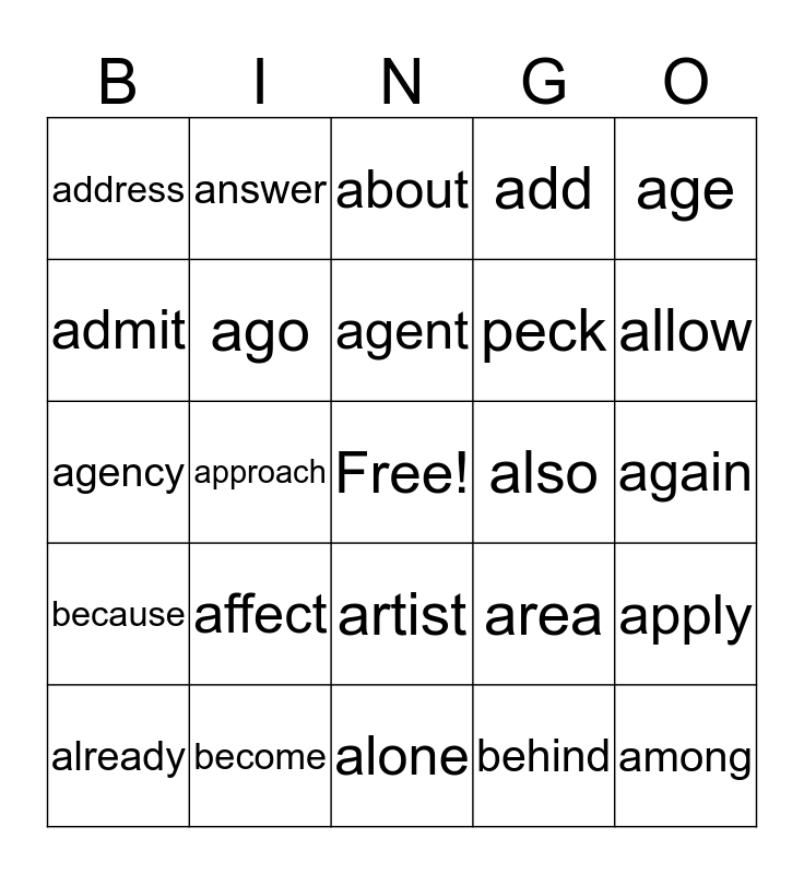 This bingo card has a free space and 80 words: ability, able, about, above, accept, according, account, across, act, action, activity, actually, add, address, administration, admit, adult, affect, after, again, against, age, agency, agent, ago, agree, agreement, ahead, air, all, allow, almost, alone, along, already, also, although, always, American, among, amount, analysis, gamble, animal, another, answer, any, anyone, anything, appear, apply, approach, area, argue, arm, around, arrive, art, article, artist, peck, justice, assume, slum, attack, attention, attorney, audience, beat, beautiful, because, become, bed, before, begin, behavior, behind, believe, benefit and best.