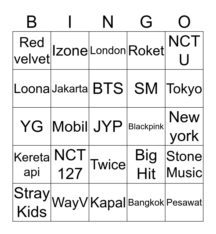 This bingo card has a free space and 24 words: NCT 127, WayV, BTS, Stray Kids, NCT U, Red velvet, Loona, Izone, Blackpink, Twice, SM, YG, Big Hit, Stone Music, Jakarta, Bangkok, New york, London, Tokyo, Mobil, Pesawat, Kereta api, Roket and Kapal.