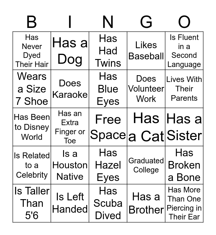 This bingo card has a free space and 24 words: Is a Houston Native, Is Left Handed, Has Blue Eyes, Is Taller Than 5'6, Is Fluent in a Second Language, Has Never Dyed Their Hair, Wears a Size 7 Shoe, Has a Dog, Has a Cat, Has Hazel Eyes, Does Volunteer Work, Has Been to Disney World, Graduated College, Has Broken a Bone, Does Karaoke, Has a Brother, Has a Sister, Has Had Twins, Lives With Their Parents, Has an Extra Finger or Toe, Has More Than One Piercing in Their Ear, Is Related to a Celebrity, Likes Baseball and Has Scuba Dived.
