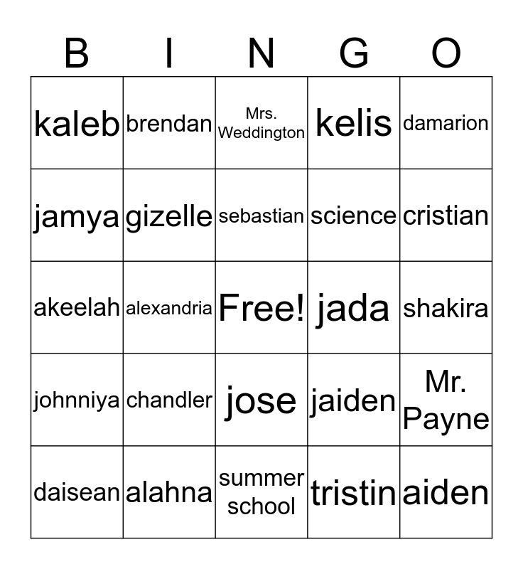 This bingo card has a free space and 41 words: akeelah, akeelah, robert, gizelle, alahna, jose, sebastian, angelo, damarion, johnniya, alexandria, kelis, aiden, shakira, jada, chandler, alisa, kaleb, Ms. Ford, Mrs. Weddington, Mr. Payne, CPMS, summer school, science, jordin, jarod, tristin, darrius, cristian, manuel, kennedy, brendan, daisean, bria, jaiden, jamya, danielle, alex, xavion, earic and jaida w.