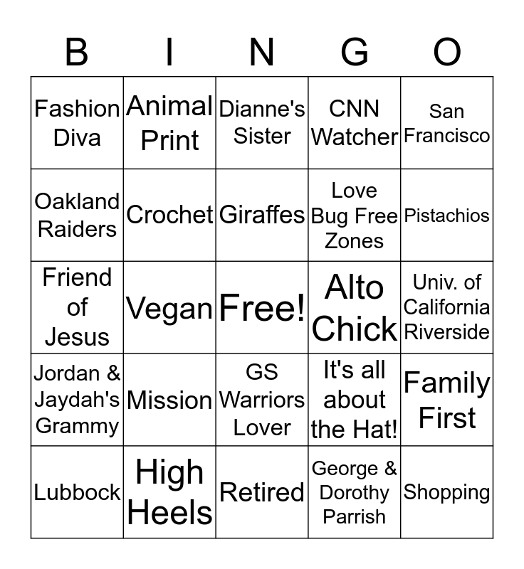 This bingo card has a free space and 24 words: Mission, High Heels, Giraffes, Lubbock, San Francisco, Fashion Diva, Oakland Raiders, Animal Print, Alto Chick, GS Warriors Lover, Love Bug Free Zones, Friend of Jesus, It's all about the Hat!, Family First, Crochet, George & Dorothy Parrish, Univ. of California Riverside, Dianne's Sister, Pistachios, Vegan, Shopping, Jordan & Jaydah's Grammy, CNN Watcher and Retired.