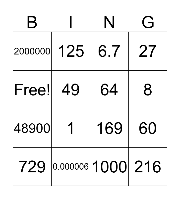 This bingo card has 16 words: 0.000006, 60, 6.7, 2000000, 48900, 125, 169, 1000, Free!, 49, 729, 27, 1, 8, 64 and 216.