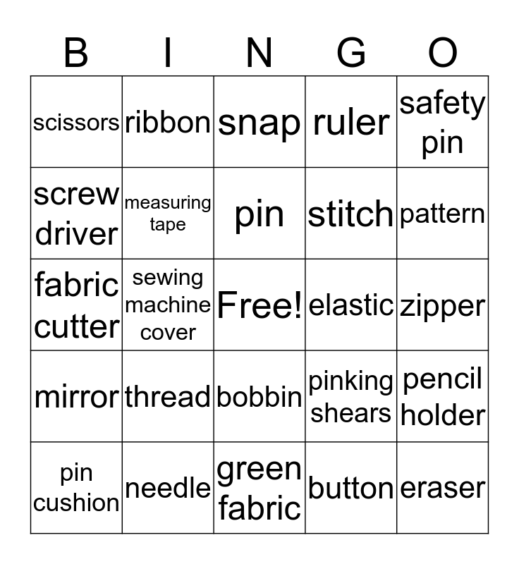 This bingo card has a free space and 24 words: thread, needle, pin, pin cushion, safety pin, scissors, screw driver, ribbon, elastic, bobbin, stitch, fabric cutter, pinking shears, pencil holder, measuring tape, button, zipper, snap, pattern, sewing machine cover, eraser, mirror, ruler and green fabric.