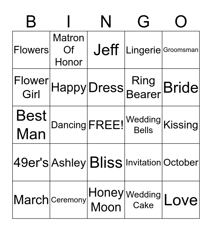 This bingo card has a free space and 30 words: Ceremony, Champagne, Dancing, Diamond Ring, Flowers, Jeff, Happy, Bliss, Wedding Bells, Honey Moon, Kissing, Love, Wedding Cake, Veil, Bride, Bridesmaid, Invitation, 49er's, Ashley, Groomsman, Best Man, Maid Of Honor, Matron Of Honor, Ring Bearer, Flower Girl, Lingerie, October, March, Dress and Tuxedo.