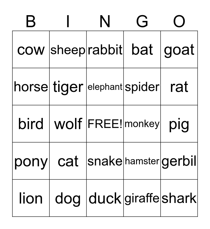 This bingo card has a free space and 24 words: cat, dog, elephant, lion, goat, cow, horse, sheep, monkey, snake, spider, bird, hamster, gerbil, tiger, giraffe, pig, rabbit, rat, wolf, shark, pony, bat and duck.
