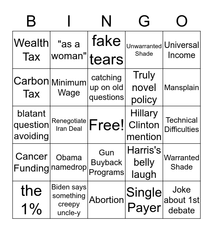 This bingo card has a free space and 29 words: the 1%, touchy identity politics, Renegotiate Iran Deal, Foreign Language, Wealth Tax, fake tears, Minimum Wage, Obama namedrop, Hillary Clinton mention, Biden says something creepy uncle-y, Technical Difficulties, Joke about 1st debate, Abortion, Single Payer, Mansplain, DNC rigged, Gun Buyback Programs, Cancer Funding, Universal Income, blatant question avoiding, Harris's belly laugh, Impeach Trump, Truly novel policy, Carbon Tax, Unwarranted Shade, "as a woman", Warranted Shade, catching up on old questions and Military Service Mention.