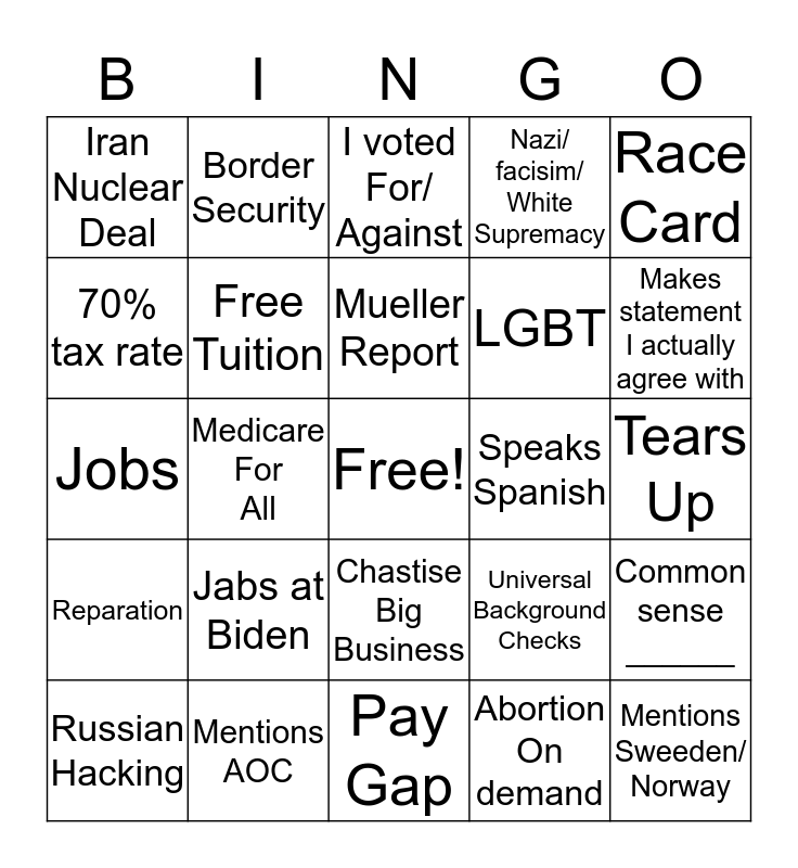 This bingo card has a free space and 32 words: Abortion On demand, Assault Rifle, Medicare For All, BLM, Reparation, Free Tuition, Race Card, Common sense ______, Border Security, Socialism, Mueller Report, I voted For/ Against, Alt-right, Positive Statement About Obama, Speaks Spanish, Student Debt, Russian Hacking, Jobs, Chastise Big Business, Jabs at Biden, Universal Background Checks, Incorrect Statement About Firearms, Tears Up, Mentions AOC, Mentions Sweeden/ Norway, Nazi/ facisim/ White Supremacy, LGBT, 70% tax rate, Iran Nuclear Deal, Pay Gap, Relates gun control to hunting and Makes statement I actually agree with.