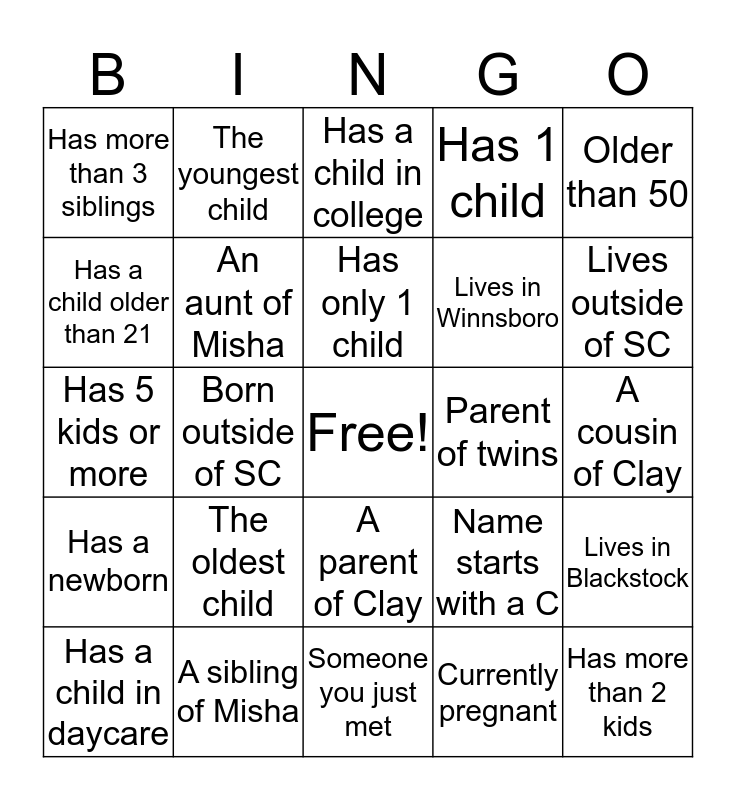 This bingo card has a free space and 24 words: The oldest child, A sibling of Misha, Has only 1 child, Has a child in daycare, Older than 50, Has more than 3 siblings, Has a child older than 21, The youngest child, Parent of twins, A parent of Clay, Lives in Winnsboro, Has 5 kids or more, Name starts with a C, Lives in Blackstock, An aunt of Misha, Currently pregnant, A cousin of Clay, Has a child in college, Lives outside of SC, Born outside of SC, Has more than 2 kids, Has a newborn, Has 1 child and Someone you just met.