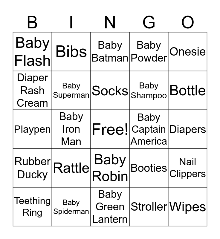 This bingo card has a free space and 30 words: Baby Spiderman, Baby Thor, Baby Iron Man, Baby Hulk, Baby Flash, Baby Batman, Baby Superman, Baby Robin, Baby Captain America, Baby Green Lantern, Diapers, Wipes, Stroller, Pacifier, Bottle, Crib, Booties, Rubber Ducky, Rattle, Onesie, Playpen, Bassinet, Bibs, Baby Shampoo, Diaper Rash Cream, Baby Powder, Nail Clippers, Teething Ring, Socks and Beanie.
