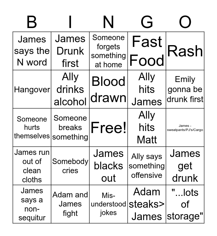 This bingo card has a free space and 28 words: James get drunk, Unintended Nudity, Ally hits James, Adam steaks> James, Hangover, Someone forgets something at home, James Drunk first, James run out of clean cloths, Ally hits Matt, James says a non-sequitur, Someone hurts themselves, Fast Food, Adam and James fight, Mis-understood jokes, Emily gonna be drunk first, Vomit, Somebody cries, Ally drinks alcohol, Blood drawn, James blacks out, James says the N word, Norm jokes, "...lots of storage", Someone breaks something, James - sweatpants/PJ's/Cargo, Ally says something offensive, Rash and Ally says something overtly sexual.