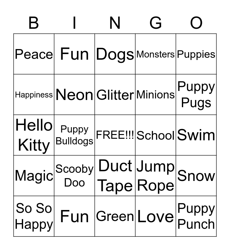 This bingo card has a free space and 24 words: Scooby Doo, Fun, Glitter, So So Happy, Puppies, Peace, Happiness, Fun, School, Duct Tape, Minions, Hello Kitty, Jump Rope, Snow, Neon, Love, Swim, Dogs, Puppy Pugs, Puppy Bulldogs, Puppy Punch, Magic, Monsters and Green.