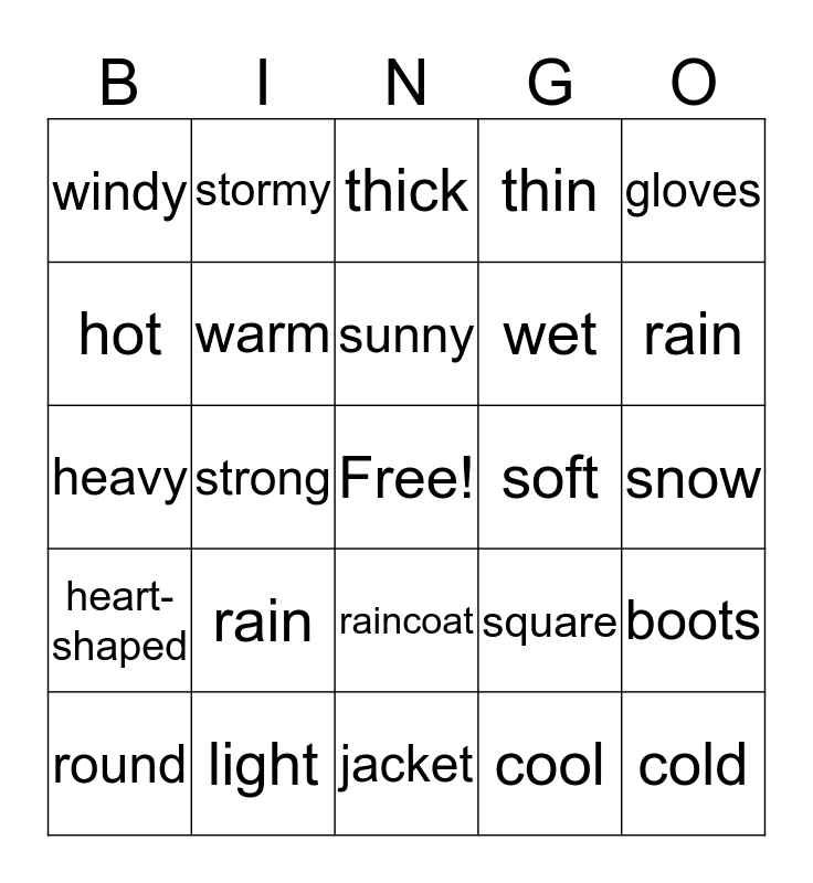 This bingo card has a free space and 24 words: rain, light, sunny, round, gloves, windy, hot, stormy, soft, raincoat, wet, heavy, square, boots, warm, cool, snow, thick, rain, strong, cold, heart-shaped, thin and jacket.