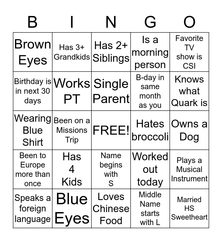This bingo card has a free space and 24 words: Has 4 Kids, Blue Eyes, Single Parent, Speaks a foreign language, Favorite TV show is CSI, Brown Eyes, Birthday is in next 30 days, Has 3+ Grandkids, Hates broccoli, Name begins with S, B-day in same month as you, Wearing Blue Shirt, Worked out today, Plays a Musical Instrument, Works PT, Middle Name starts with L, Owns a Dog, Has 2+ Siblings, Knows what Quark is, Been on a Missions Trip, Married HS Sweetheart, Been to Europe more than once, Is a morning person and Loves Chinese Food.