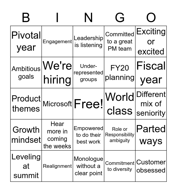This bingo card has a free space and 24 words: Hear more in coming the weeks, Realignment, Under- represented groups, Leveling at summit, Exciting or excited, Pivotal year, Ambitious goals, Engagement, World class, Empowered to do their best work, FY20 planning, Product themes, Role or Responsibility ambiguity, Parted ways, We're hiring, Commitment to diversity, Different mix of seniority, Leadership is listening, Fiscal year, Microsoft, Customer obsessed, Growth mindset, Committed to a great PM team and Monologue without a clear point.