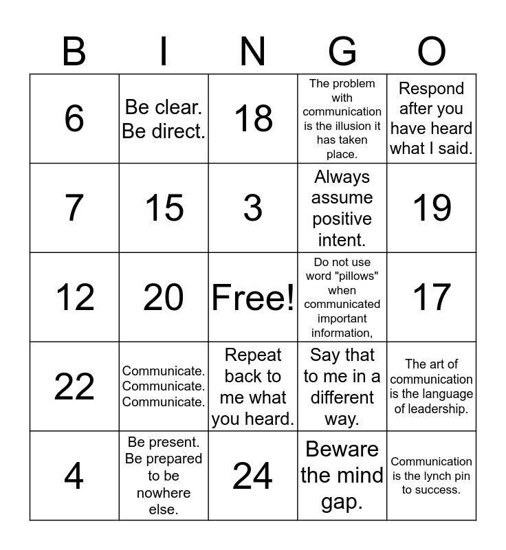 This bingo card has a free space and 24 words: Communicate. Communicate. Communicate., Be present. Be prepared to be nowhere else., 3, 4, Respond after you have heard what I said., 6, 7, Be clear. Be direct., Do not use word "pillows" when communicated important information,, Repeat back to me what you heard., Always assume positive intent., 12, Say that to me in a different way., The art of communication is the language of leadership., 15, Beware the mind gap., 17, 18, 19, 20, Communication is the lynch pin to success., 22, The problem with communication is the illusion it has taken place. and 24.
