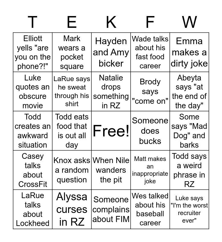 This bingo card has a free space and 24 words: Knox asks a random question, Alyssa curses in RZ, Natalie drops something in RZ, LaRue talks about Lockheed, Emma makes a dirty joke, Elliott yells "are you on the phone?!", Luke quotes an obscure movie, Mark wears a pocket square, Someone does bucks, When Nile wanders the pit, Brody says "come on", Todd creates an awkward situation, Matt makes an inappropriate joke, Todd says a weird phrase in RZ, LaRue says he sweat through his shirt, Wes talked about his baseball career, Some says "Mad Dog" and barks, Hayden and Amy bicker, Abeyta says "at the end of the day", Todd eats food that is out all day, Luke says "I'm the worst recruiter ever", Casey talks about CrossFit, Wade talks about his fast food career and Someone complains about FIM.