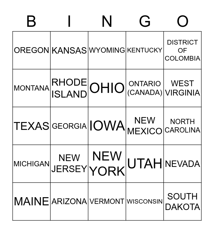 This bingo card has 25 words: NEW JERSEY, VERMONT, OHIO, MAINE, DISTRICT OF COLOMBIA, OREGON, MONTANA, KANSAS, NEW MEXICO, NEW YORK, ONTARIO (CANADA), TEXAS, UTAH, NEVADA, RHODE ISLAND, SOUTH DAKOTA, NORTH CAROLINA, WYOMING, WEST VIRGINIA, GEORGIA, IOWA, ARIZONA, MICHIGAN, KENTUCKY and WISCONSIN.