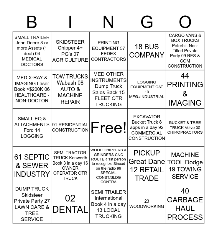 This bingo card has a free space and 25 words: SEMI TRACTOR TRUCK Kenworth Book 3 in a day 16 OWNER OPERATOR OTR TRUCK, SEMI TRAILER International Book 4 in a day 13 LOCAL TRUCKING, MED OTHER INSTRUMENTS Dump Truck Sales Back 15 FLEET OTR TRUCKING, DUMP TRUCK Skidsteer Private Party 27 LAWN CARE & TREE SERVICE, CARGO VANS & BOX TRUCKS Peterbilt Non-Titled Private Party 09 RES & COM CONSTRUCTION, SMALL TRAILER John Deere 8 or more Assets (1 deal) 04 MEDICAL DOCTORS, MED X-RAY & IMAGING Laser Book >$200K 06 HEALTHCARE - NON-DOCTOR, SKIDSTEER Chipper 4+ PG's 07 AGRICULTURE, EXCAVATOR Bucket Truck 8 apps in a day 92 COMMERCIAL CONSTRUCTION, WOOD CHIPPERS & GRINDERS CNC ROUTER 1st person to recognize Sinead on the radio 99 SPECIAL CONST/BLDG CONTRA, LOGGING EQUIPMENT CAT 10 MFG./INDUSTRIAL, SMALL EQ & ATTACHMENTS Ford 14 LOGGING, PICKUP Great Dane 12 RETAIL TRADE, MACHINE TOOL Dodge 19 TOWING SERVICE, TOW TRUCKS Wabash 08 AUTO & MACHINE REPAIR, RESTAURANT EQUIPMENT CYNOSURE 24 RESTAURANT / FOOD SERVICE, BUCKET & TREE TRUCK Volvo 05 CHIROPRACTORS, PRINTING EQUIPMENT 57 FEDEX CONTRACTORS, 44 PRINTING & IMAGING, 91 RESIDENTIAL CONSTRUCTION, 40 GARBAGE HAUL PROCESS, 02 DENTAL, 61 SEPTIC & SEWER INDUSTRY, 18 BUS COMPANY and 23 WOODWORKING.