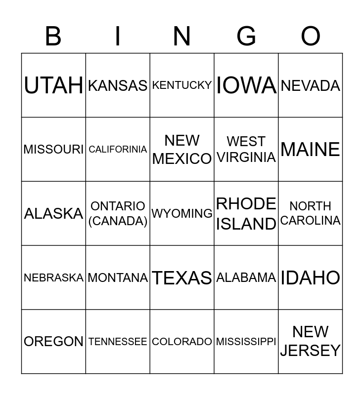 This bingo card has 25 words: MONTANA, COLORADO, NEW MEXICO, OREGON, NEVADA, UTAH, MISSOURI, KANSAS, RHODE ISLAND, TEXAS, WEST VIRGINIA, ALASKA, ALABAMA, IDAHO, CALIFORINIA, NEW JERSEY, NORTH CAROLINA, KENTUCKY, MAINE, ONTARIO (CANADA), WYOMING, TENNESSEE, NEBRASKA, IOWA and MISSISSIPPI.