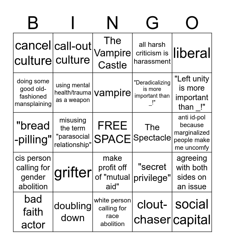 This bingo card has a free space and 24 words: bad faith actor, grifter, vampire, clout-chaser, liberal, cancel culture, call-out culture, The Vampire Castle, The Spectacle, anti id-pol because marginalized people make me uncomfy, "bread -pilling", using mental health/trauma as a weapon, "secret privilege", agreeing with both sides on an issue, doing some good old-fashioned mansplaining, doubling down, white person calling for race abolition, all harsh criticism is harassment, "Left unity is more important than _!", cis person calling for gender abolition, misusing the term "parasocial relationship", make profit off of "mutual aid", "Deradicalizing is more important than _!" and social capital.
