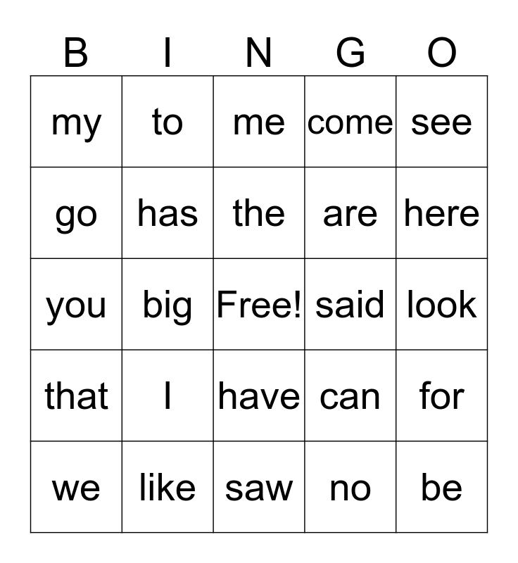 This bingo card has a free space and 24 words: I, like, the, we, see, my, go, to, said, have, are, you, can, for, has, no, look, me, here, big, be, that, come and saw.