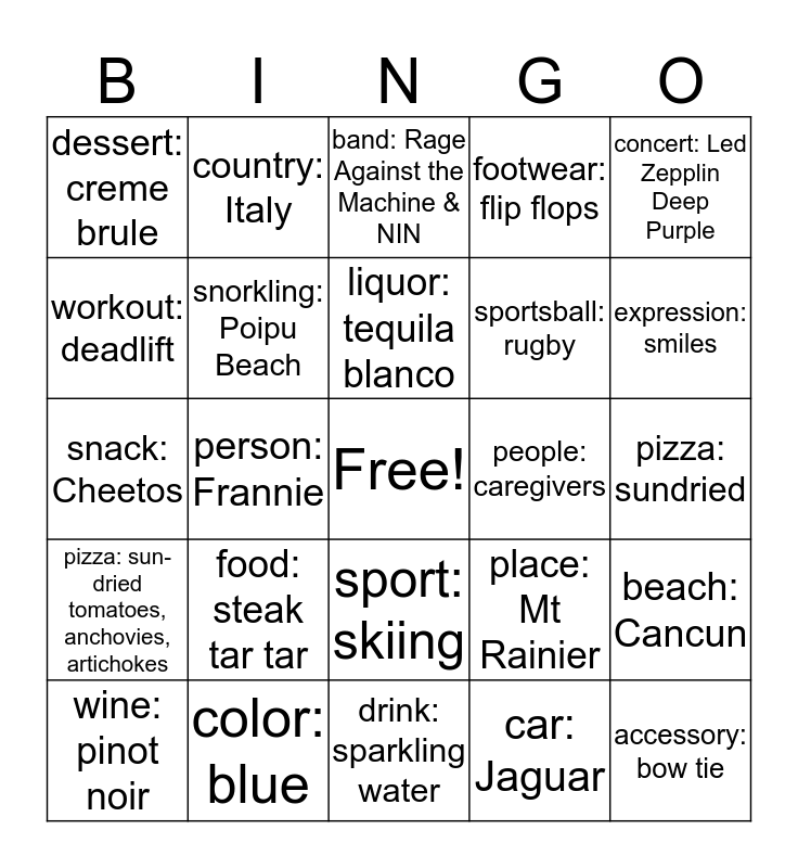 This bingo card has a free space and 25 words: food: steak tar tar, drink: sparkling water, liquor: tequila blanco, wine: pinot noir, concert: Led Zepplin Deep Purple, dessert: creme brule, workout: deadlift, country: Italy, people: caregivers, sport: skiing, sportsball: rugby, snack: Cheetos, place: Mt Rainier, beach: Cancun, snorkling: Poipu Beach, play: practical jokes, pizza: sundried, band: Rage Against the Machine & NIN, expression: smiles, person: Frannie, accessory: bow tie, color: blue, pizza: sun-dried tomatoes, anchovies, artichokes, footwear: flip flops and car: Jaguar.