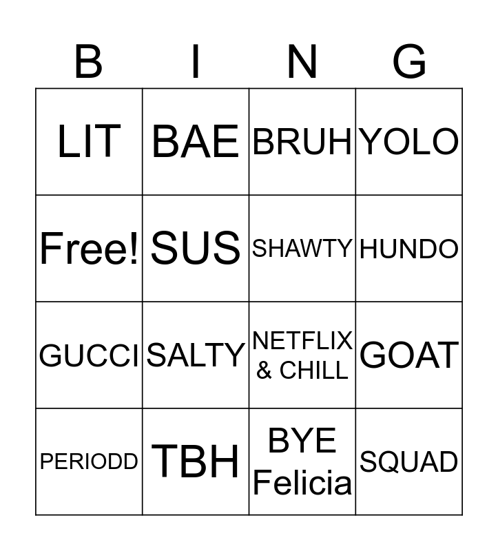 This bingo card has 16 words: TBH, GOAT, BRUH, LIT, GUCCI, BAE, NETFLIX & CHILL, BYE Felicia, Free!, SUS, PERIODD, YOLO, SALTY, HUNDO, SHAWTY and SQUAD.
