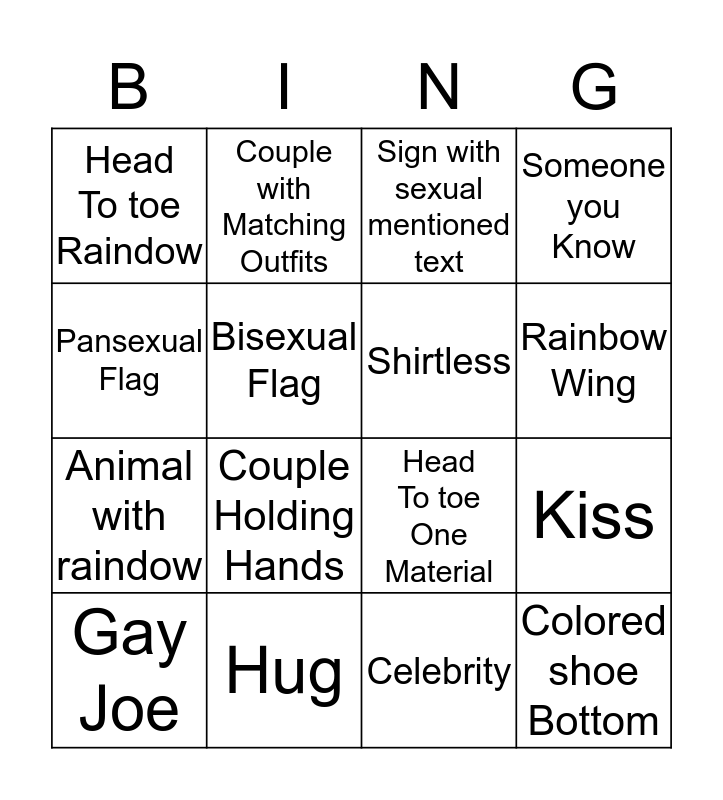 This bingo card has 16 words: Hug, Kiss, Sign with sexual mentioned text, Head To toe Raindow, Animal with raindow, Couple with Matching Outfits, Head To toe One Material, Celebrity, Pansexual Flag, Bisexual Flag, Gay Joe, Someone you Know, Couple Holding Hands, Rainbow Wing, Shirtless and Colored shoe Bottom.