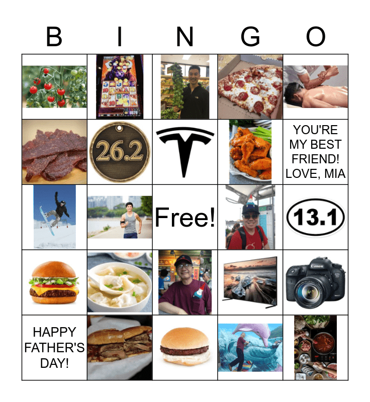 This bingo card has 35 images, a free space and 2 words: YOU'RE MY BEST FRIEND! LOVE, MIA and HAPPY FATHER'S DAY!.