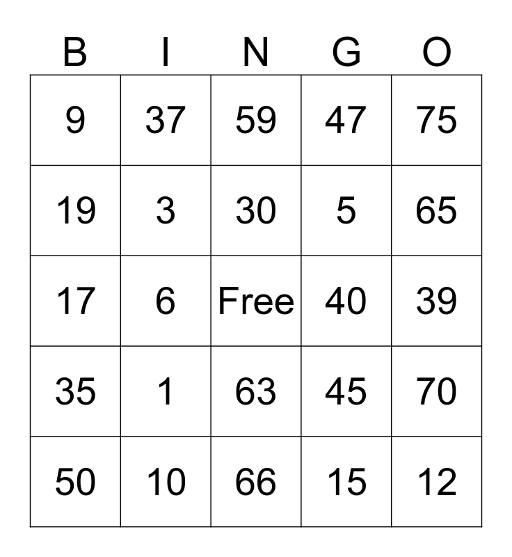 This bingo card has a free space and 24 words: 1, 10, 30, 50, 75, 9, 19, 37, 40, 63, 5, 17, 45, 70, 3, 15, 39, 59, 65, 6, 12, 35, 47 and 66.