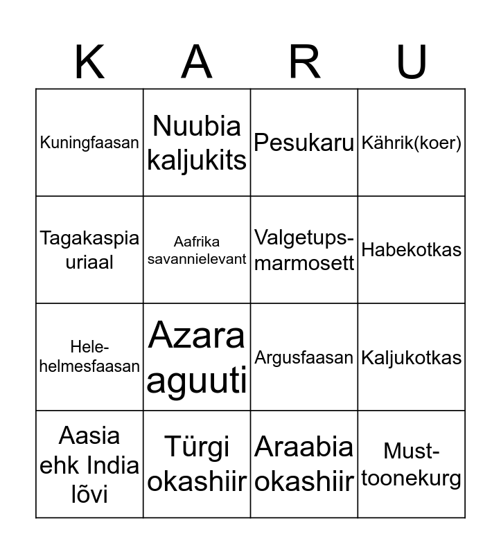 This bingo card has 99 words: Free!, Jaapani makaak, Kääbusmarmosett, Valgetups- marmosett, Simpans, Pintsetamariin, Ida- aafrika teravmokk- ninasarvik, Prževalski hobune, Kulaan, Karakal, Luitekass, Lakkhunt, Amuuri leopard, Aasia ehk India lõvi, Vööthüään, Pesukaru, Kährik(koer), Euroopa naarits, Harilik ilves, Irbis e. lumeleopard, Jääkaru, Amuuri tiiger, Kalakass, Hallhüljes, Surikaat, Bennetti känguru, Aafrika savannielevant, Baktrian, Pruun- harjasvöölane, Valgesaba- okassiga, Türgi okashiir, Tsintsilja (villakhiir), Merisiga, Deegu, Azara aguuti, Araabia okashiir, Laborirott, Berberi vööthiir, Gaur, Aksishirv, Siberi kaljukits, Tagakaspia uriaal, Nuubia kaljukits, Tadžiki markuur, Kubani tuur, Ida- sinilammas, Dagestani tuur, Buhhaara uriaal, Grööni muskusveis, Miilu ehk Davidi hirv, Tüügassiga, Kääbusjõehobu, Väikeluik, Lumehani, Vöötkakk, Kassikakk, Lumekakk, Valgeselg- faasan, Valgekõht- faasan, Sini- paabulind, Sini- kõrvukfaasan, Saatür- helmesfaasan, Puna- helmesfaasan, Pruun- kõrvukfaasan, Mikaadofaasan, Kuningfaasan, Kuldfaasan, Kroon- läikfaasan, Hõbefaasan, Hele- helmesfaasan, Birma faasan, Argusfaasan, Habekotkas, Hiireviu, Stepikotkas, Hiid-merikotkas, Kaljukotkas, Nandu, Ararauna, Sudaani maasarvik, Must-toonekurg, Marabu, Pasknäär, Hallvares, Ronk e. kaaren, Leopardkilpkonn, Keskaasia kilpkonn, Roheline kiiverbasilisk, Ida-liivaboa, Amuuri roninastik, Tiigerpüüton, Kolumbia vikersilehuulboa, Stepi-vaskuss, Maisimadu, Kuningpüüton, Harilik roninastik, Tume tiigerpüüton, Kuningboa and Kollane anakonda.