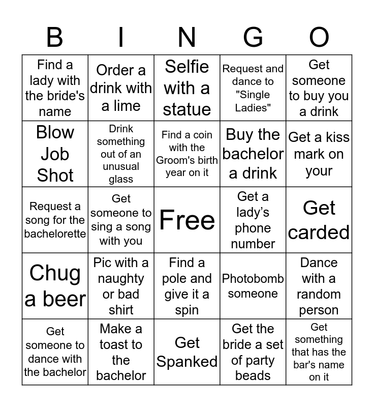 This bingo card has a free space and 25 words: Pic with a naughty or bad shirt, Get Spanked, Find a coin with the Groom's birth year on it, Get someone to dance with the bachelor, Get someone to buy you a drink, Find a lady with the bride's name, Blow Job Shot, Order a drink with a lime, Get a lady’s phone number, Find a pole and give it a spin, Buy the bachelor a drink, Request a song for the bachelorette, Photobomb someone, Dance with a random person, Drink something out of an unusual glass, Serenade the bride, Get carded, Selfie with a statue, Get a kiss mark on your, Get someone to sing a song with you, Get something that has the bar's name on it, Make a toast to the bachelor, Chug a beer, Request and dance to "Single Ladies" and Get the bride a set of party beads.