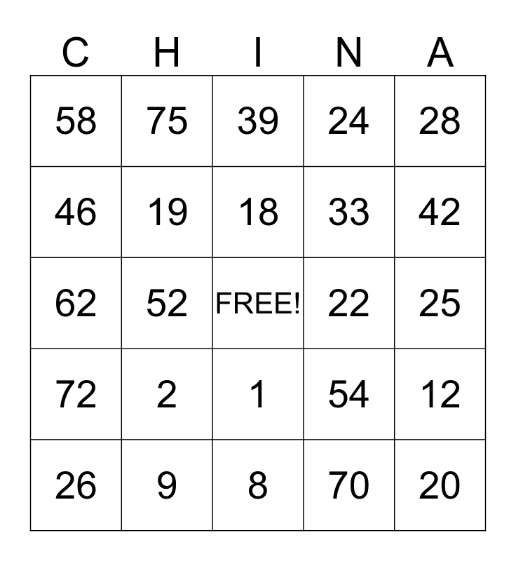 This bingo card has a free space and 24 words: 2, 9, 18, 26, 28, 58, 46, 75, 22, 1, 33, 62, 54, 12, 19, 70, 25, 39, 42, 52, 20, 72, 24 and 8.