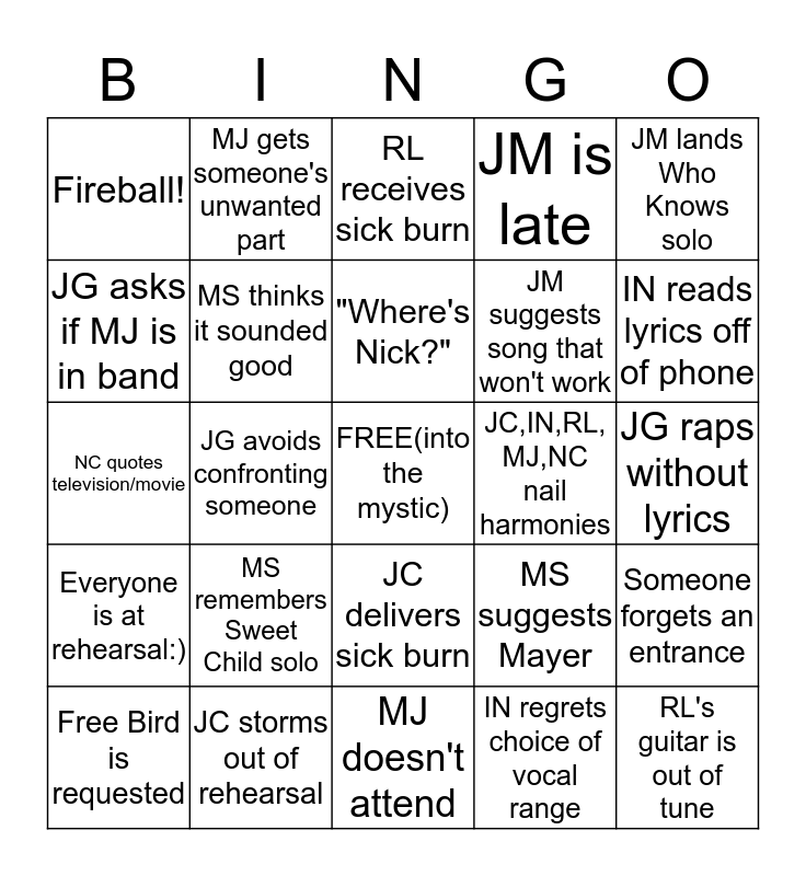 This bingo card has a free space and 24 words: MS remembers Sweet Child solo, JC storms out of rehearsal, "Where's Nick?", Free Bird is requested, JM lands Who Knows solo, Fireball!, JG asks if MJ is in band, MJ gets someone's unwanted part, JC,IN,RL, MJ,NC nail harmonies, JC delivers sick burn, JM suggests song that won't work, NC quotes television/movie, MS suggests Mayer, Someone forgets an entrance, MS thinks it sounded good, IN regrets choice of vocal range, JG raps without lyrics, RL receives sick burn, IN reads lyrics off of phone, JG avoids confronting someone, RL's guitar is out of tune, Everyone is at rehearsal:), JM is late and MJ doesn't attend.