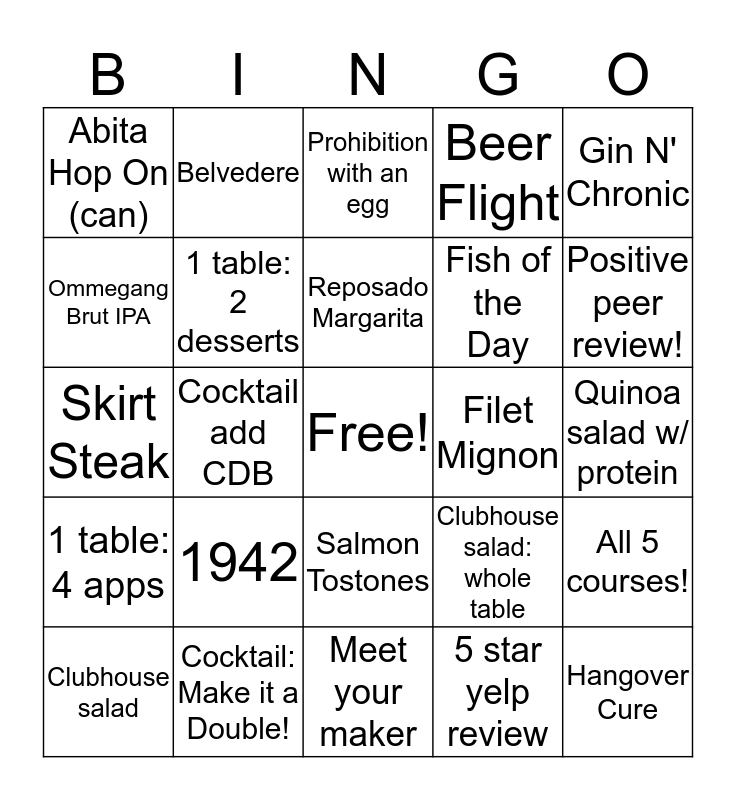 This bingo card has a free space and 24 words: 1942, Cocktail: Make it a Double!, Reposado Margarita, Clubhouse salad, Gin N' Chronic, Abita Hop On (can), Ommegang Brut IPA, Belvedere, Filet Mignon, Salmon Tostones, Fish of the Day, Skirt Steak, Clubhouse salad: whole table, All 5 courses!, 1 table: 2 desserts, 5 star yelp review, Quinoa salad w/ protein, Prohibition with an egg, Positive peer review!, Cocktail add CDB, Hangover Cure, 1 table: 4 apps, Beer Flight and Meet your maker.