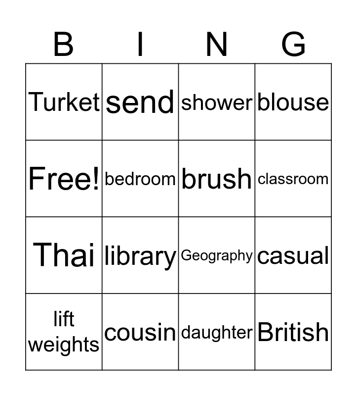 This bingo card has 16 words: cousin, casual, shower, Turket, Thai, send, Geography, daughter, Free!, bedroom, lift weights, blouse, library, classroom, brush and British.