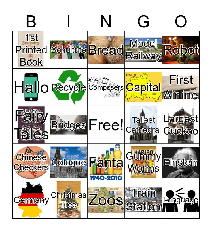 This bingo card has 29 images, a free space and 29 words: Germany, Forests, Bridges, Football, 1st Printed Book, Bread, Recycle, Cologne, Tallest Cathedral, Christmas Tree, Largest Cuckoo, Language, Zoos, Train Station, First Airline, Hamburg, Fanta, Chinese Checkers, Robot, Fairy Tales, Gummy Worms, Castle, Capital, Hallo, Model Railway, Schultute, Einstein, Composers and Luxury Cars.