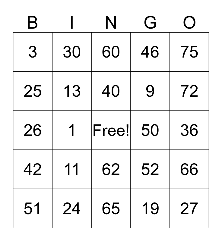 This bingo card has a free space and 24 words: 11, 24, 40, 51, 75, 3, 25, 30, 50, 62, 9, 26, 52, 66, 13, 19, 36, 60, 72, 1, 27, 42, 46 and 65.