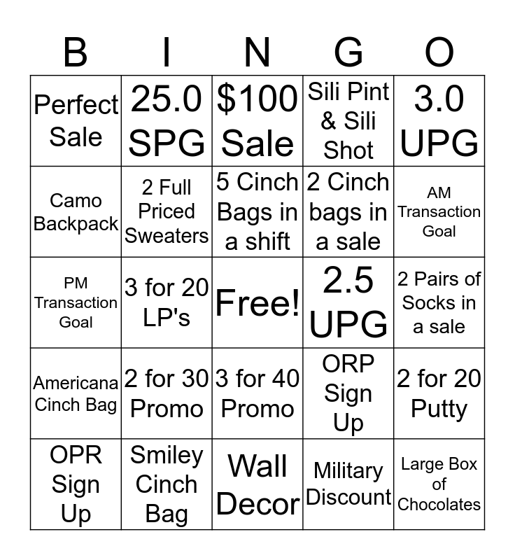 This bingo card has a free space and 24 words: 2 for 30 Promo, Smiley Cinch Bag, 5 Cinch Bags in a shift, OPR Sign Up, 3.0 UPG, Perfect Sale, Camo Backpack, 25.0 SPG, 2.5 UPG, 3 for 40 Promo, 2 Cinch bags in a sale, PM Transaction Goal, ORP Sign Up, 2 for 20 Putty, 2 Full Priced Sweaters, Military Discount, 2 Pairs of Socks in a sale, $100 Sale, AM Transaction Goal, 3 for 20 LP's, Large Box of Chocolates, Americana Cinch Bag, Sili Pint & Sili Shot and Wall Decor.