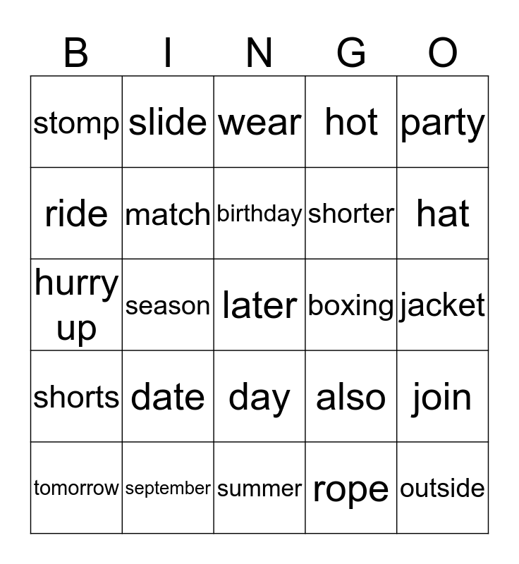 This bingo card has a free space and 24 words: date, september, birthday, tomorrow, party, stomp, ride, slide, boxing, day, shorter, hurry up, also, join, match, rope, jacket, wear, hat, season, outside, shorts, hot and summer.