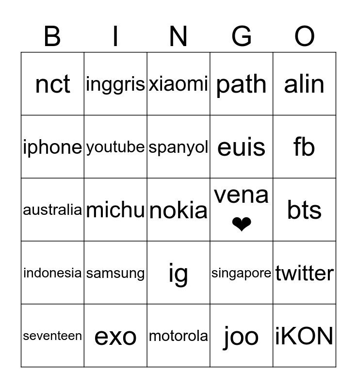 This bingo card has a free space and 24 words: samsung, exo, spanyol, seventeen, alin, nct, iphone, inggris, vena ❤, ig, euis, australia, singapore, twitter, youtube, joo, bts, xiaomi, fb, michu, iKON, indonesia, path and motorola.