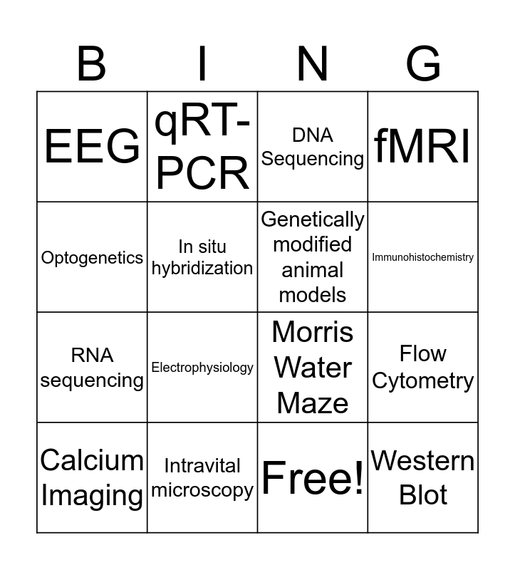 This bingo card has 17 words: Free!, Calcium Imaging, DNA Sequencing, EEG, Electrophysiology, fMRI, Flow Cytometry, Genetically modified animal models, Immunohistochemistry, In situ hybridization, Intravital microscopy, Morris Water Maze, Optogenetics, qRT-PCR, RNA sequencing, Tissue culture and Western Blot.